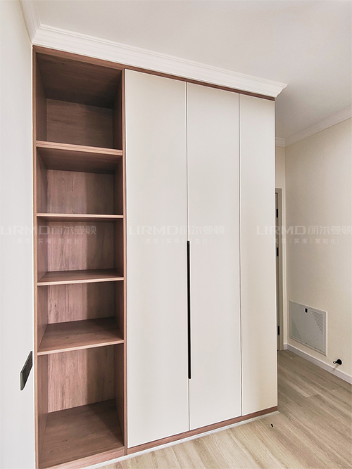 右側一門到頂膚感柜門,干凈又不失質感,滿滿的收納空間。