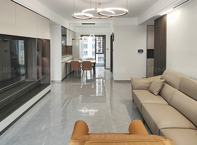 全屋通鋪瓷磚,視覺(jué)上看起來(lái)更顯大氣,電視背景墻采用整面墻做儲(chǔ)物柜設(shè)計(jì),整體效果不顯沉悶,