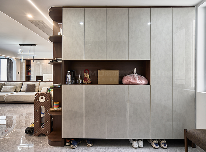 實木柜體搭配PET膚感柜門,鞋柜側面采用圓弧角柜設計,起到遮擋緩沖作用,