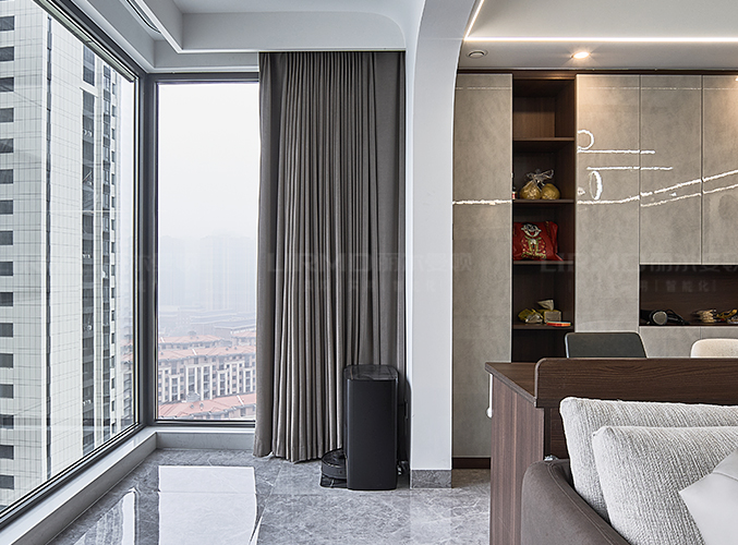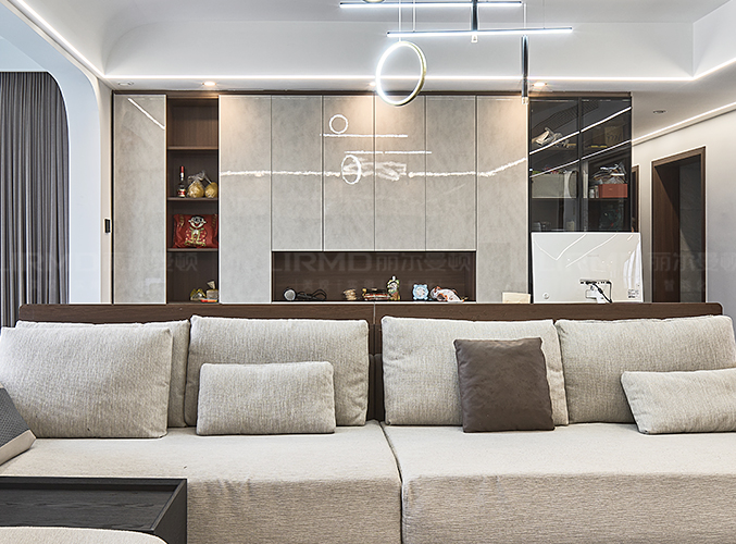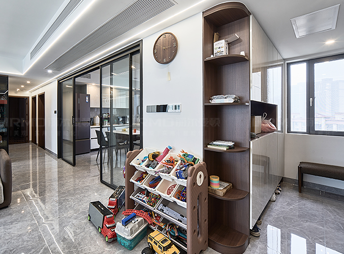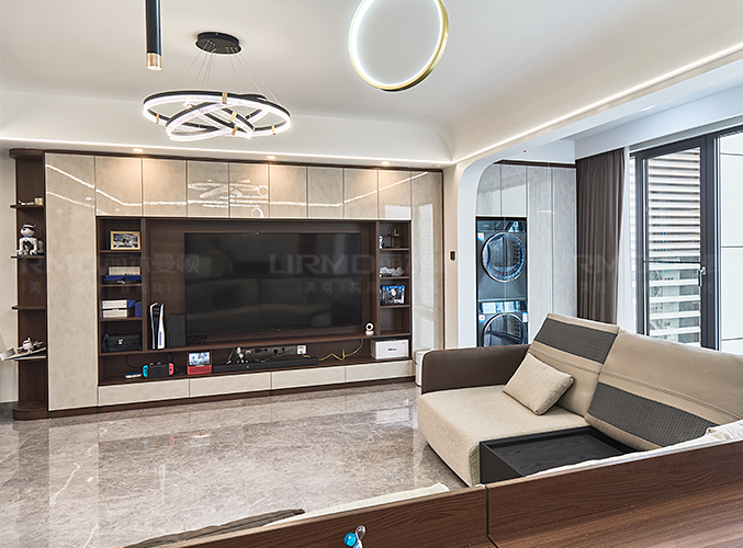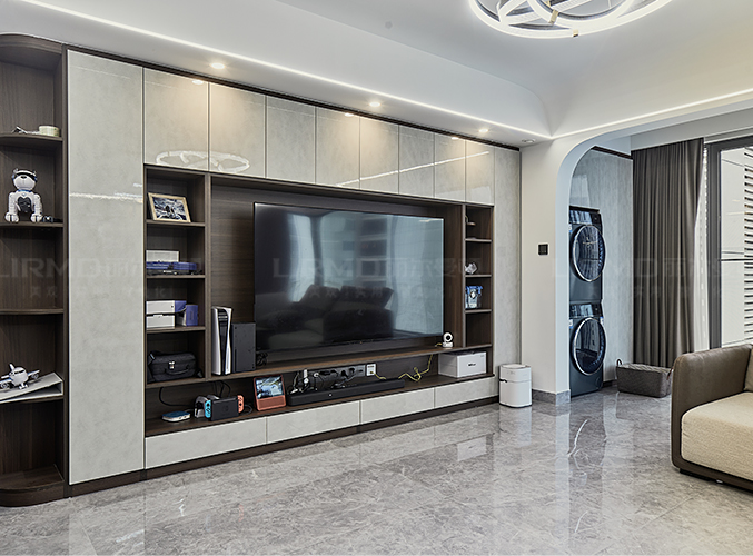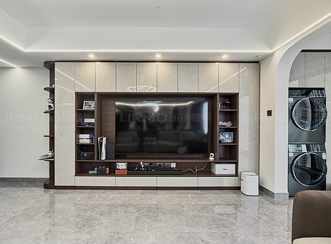 橫廳搭配全景落地窗,極簡又顯高級,電視背景墻采用整面墻做儲物柜設計,整體效果不顯沉悶,