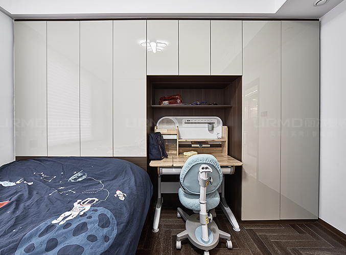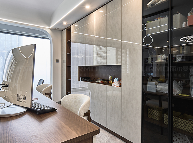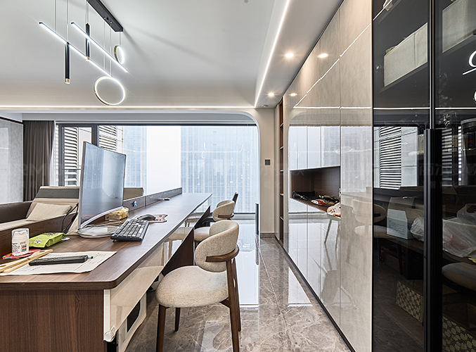 一整排儲物柜,玻璃柜門的設計削弱了柜體的厚重感,不顯沉悶,另一側做一整排的超長書桌,