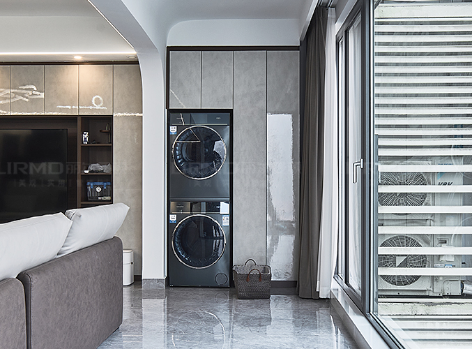 洗衣機一體柜,將洗衣機、烘干機疊放隱藏在柜體當中,不顯突兀