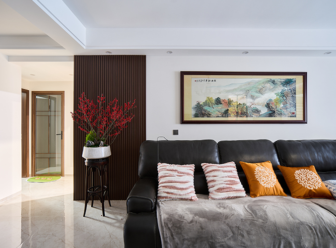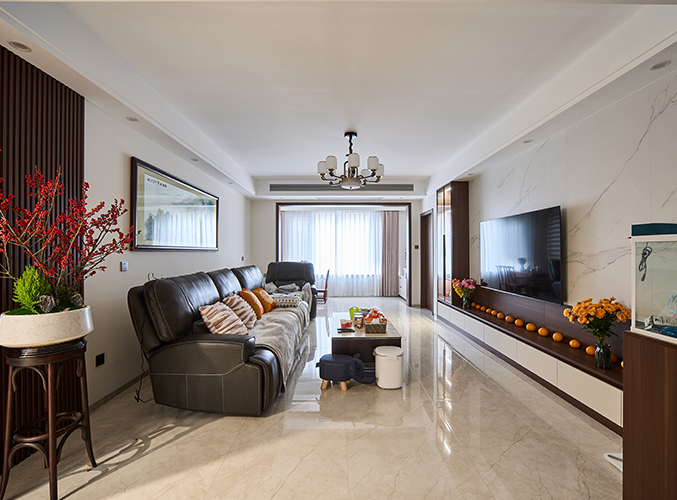 整屋通鋪瓷磚,盡顯大氣,電視背景墻采用整面墻設計,整體效果不顯沉悶,左側玻璃展示柜柜門