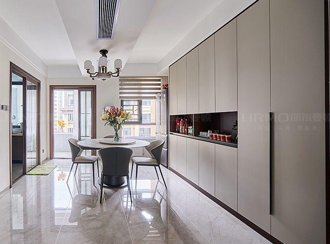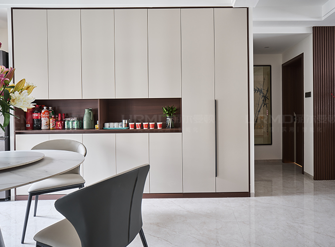 整體的墻柜很好的利用空間,收納大大的提升,無拉手設計,更顯極簡。