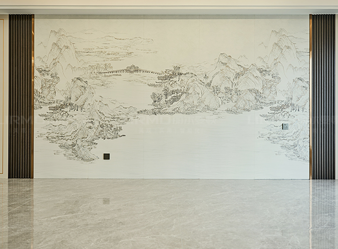 沙發(fā)背景墻帶有山水畫,增加整體的格調(diào)。