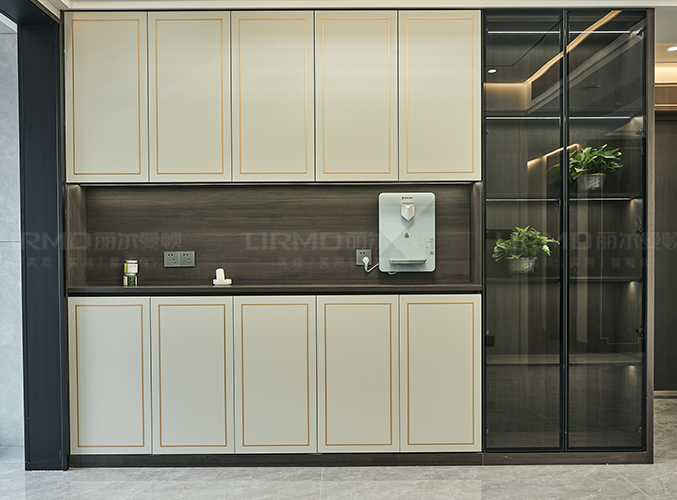 墻柜一體化,象牙灰柜門鑲嵌金屬邊框,與柜門同款式,尤加利護(hù)墻板同色配套房門柜體更顯精致,