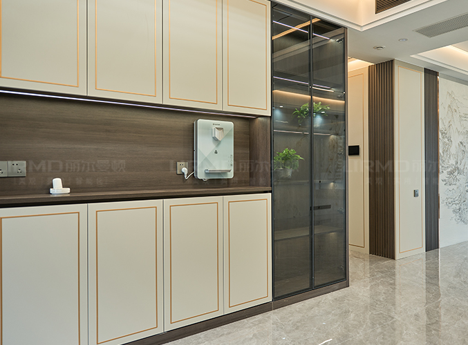 側(cè)面做整面墻的餐邊柜,搭配局部玻璃柜門收納展示兩不誤。