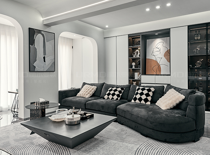 沙發(fā)背后一整墻的柜子設計,方便收納,右側玻璃展示柜柜門的設計更具設計感。