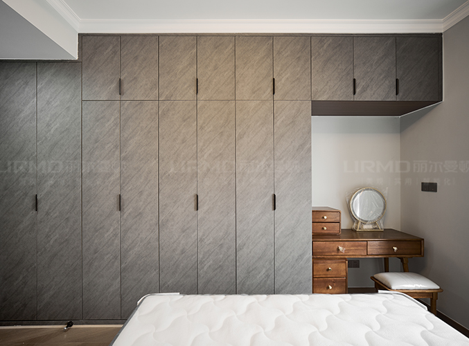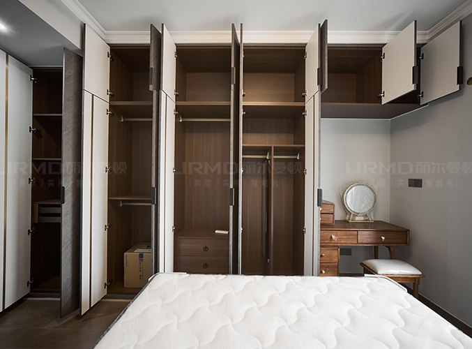 深色一柜到頂衣柜加化妝柜的設(shè)計(jì),美觀且大氣,多組設(shè)計(jì)更是實(shí)現(xiàn)收納需求,