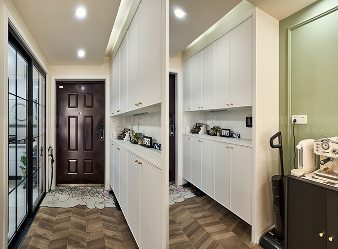 18mm厚杉木芯板,入戶與廚房用滑軌玻璃門隔開,空間更通透,