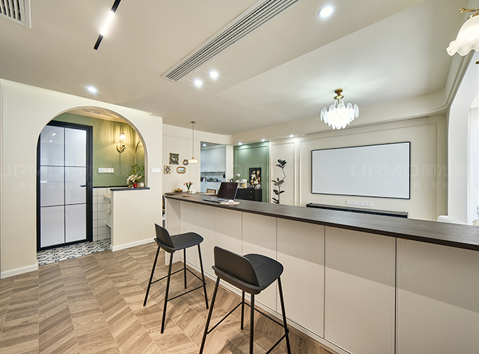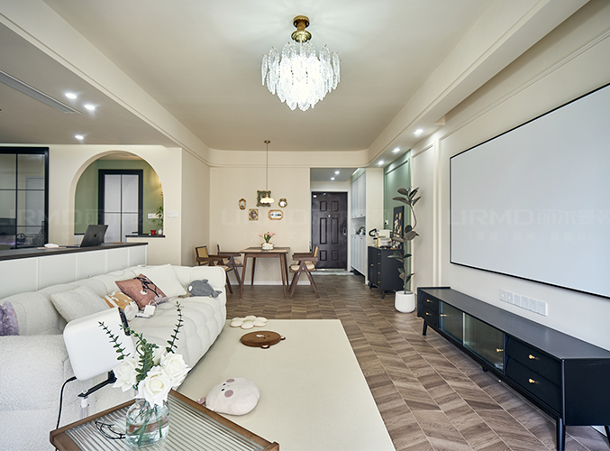 整體奶油色墻漆搭配橄欖綠,地面拼接魚骨木地板,營(yíng)造清新舒適氛圍,吊燈設(shè)計(jì),