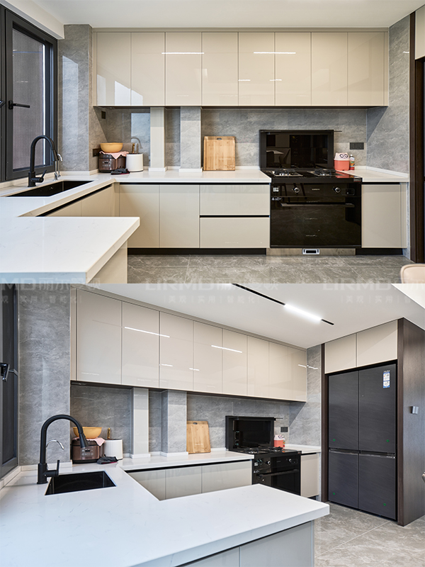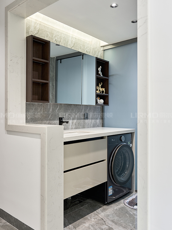 柜體\柜門型號:柜體夢幻灰\柜門琥珀白膚感 地磚品牌及型號:馬可波羅CH12800啞光