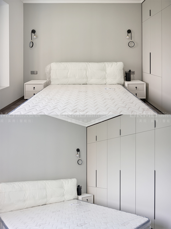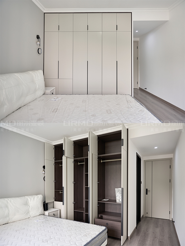 全房共定制了10個柜子,柜體采用足18厚杉木芯板,柜門采用LSB板PET膚感柜門,一門到頂,五金使用原裝進口的百隆五金