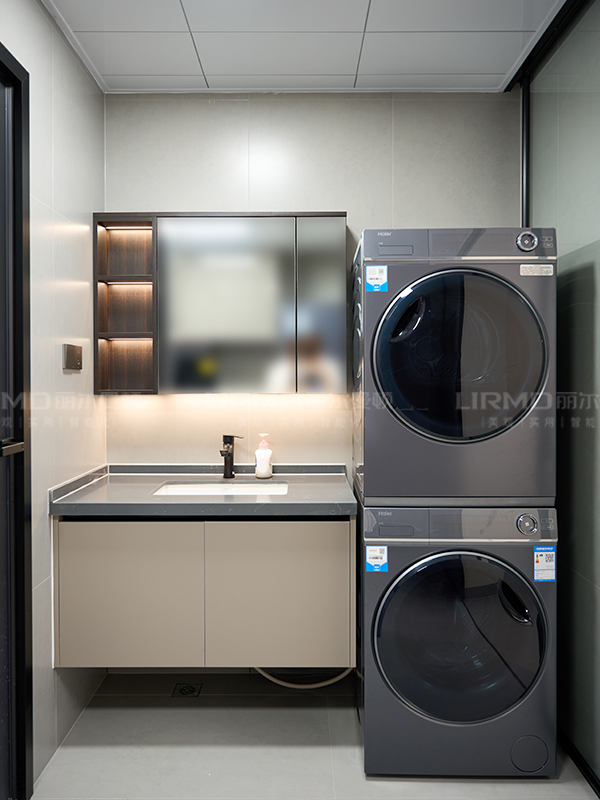 浴室柜+洗漱臺,柜體采用足18厚杉木芯板,柜門采用LSB板PET膚感柜門,一門到頂,五金使用原裝進口的百隆五金