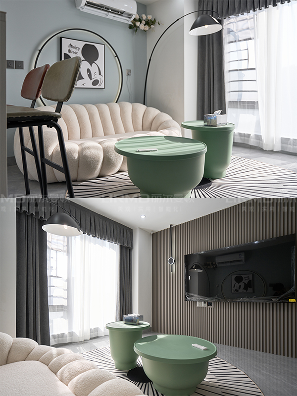 乳白色面包型沙發搭配湖藍色茶幾,時尚感upup