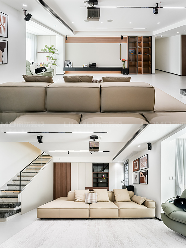 客廳做投影設計,電視背景簡約留白,沙發選雙面的,開放式書房+客廳,舒適耐看。
